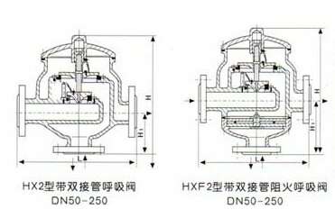 HXF2带双接管呼吸阀根据国家标准《石油化工企业设计防火规范》(GB50160-92)之规定:甲、乙类液体的固定顶罐,应设阻火器和呼吸阀。可见呼吸阀、阻火器是储罐不可缺少的安全设施。它不仅能维持储罐气压平衡,确保储罐在超压或真空时免遭破坏,且能减少罐内介质的挥发和损耗。上海南京鑫宇咖啡饮品有限公司厂生产的呼吸阀,具有结构紧凑、通气量大、泄漏量小、密封性能好等特点。