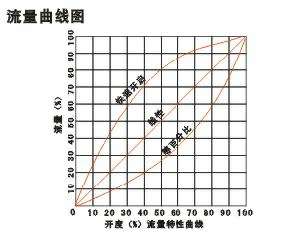 上图为该种阀门的流量特性曲线,本厂生产的是其中等百分比特性阀门。从曲线图上可知给开度一个相等的变化率,则流量的变化率相等,其特点是开度大时流量大,开度小时则流量小。而工程中大都在流量大时应用,等百分比阀门恰恰适用这个要求。根据这一特点,可以自如的予置某一流量(快开阀门和线性阀门则不具备这种功能)而且当需要变化时,还能知道变化量,达到理想状态。